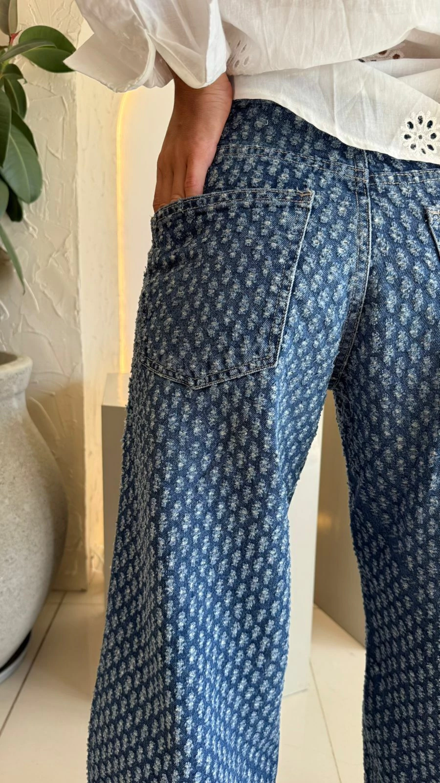 Pantalón wide azul con detalle de enganche en la tela de la marca Salsa, una prenda esencial que combina estilo y confort. Su corte wide leg es moderno y versátil, ideal para cualquier ocasión. El color azul le da un toque casual y atemporal, perfecto para armar looks relajados pero con personalidad. El detalle de enganche en la tela añade un toque único y audaz, convirtiéndolo en una pieza que se destaca.