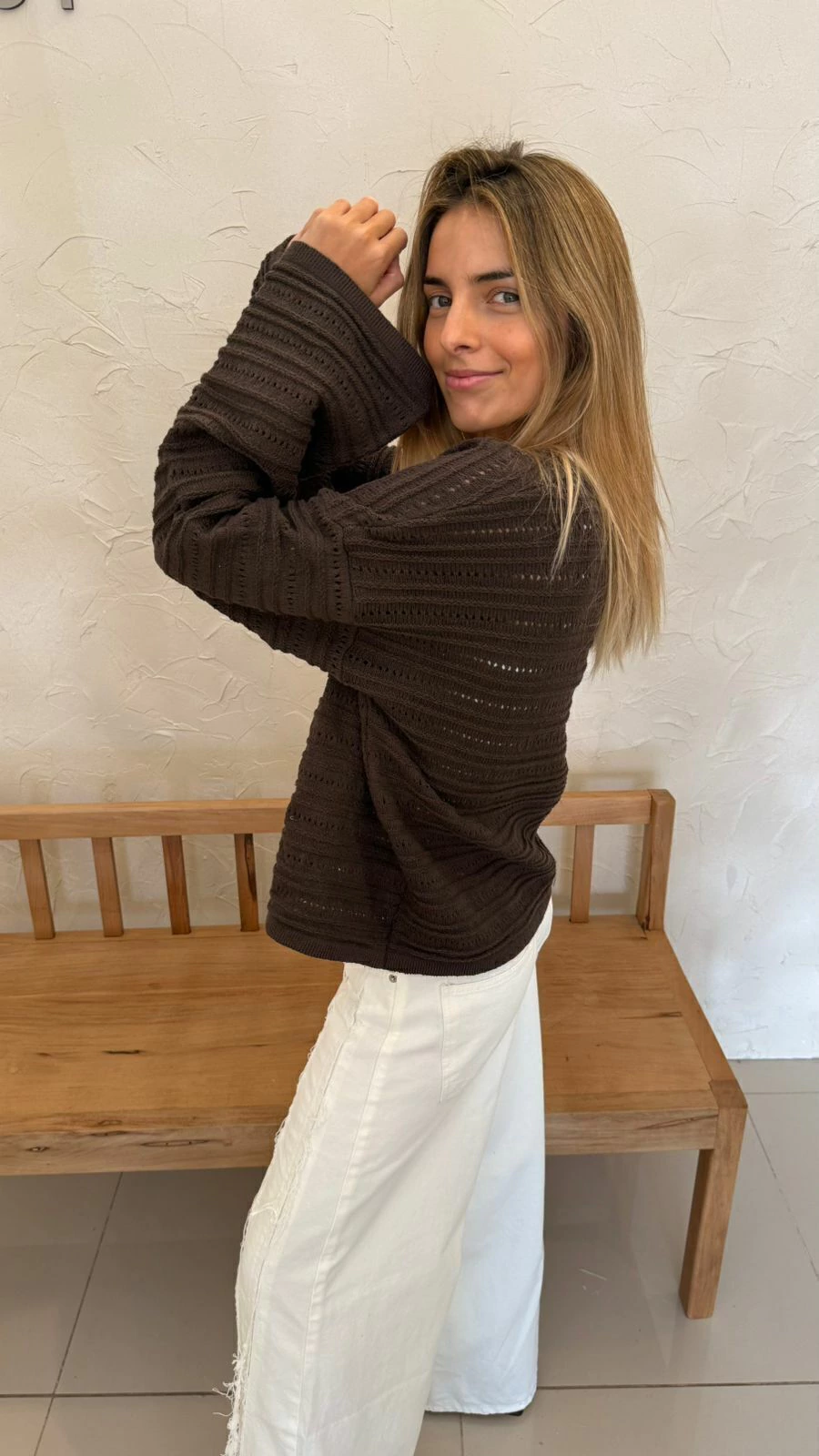 Sweater de hilo con mangas largas, ideal para esta temporada, combinando estilo y comodidad. El tejido de hilo te brinda abrigo sin ser pesado, es perfecto para lucir elegante en cualquier ocasión, ya sea para un look casual de día o para las noches más frescas.