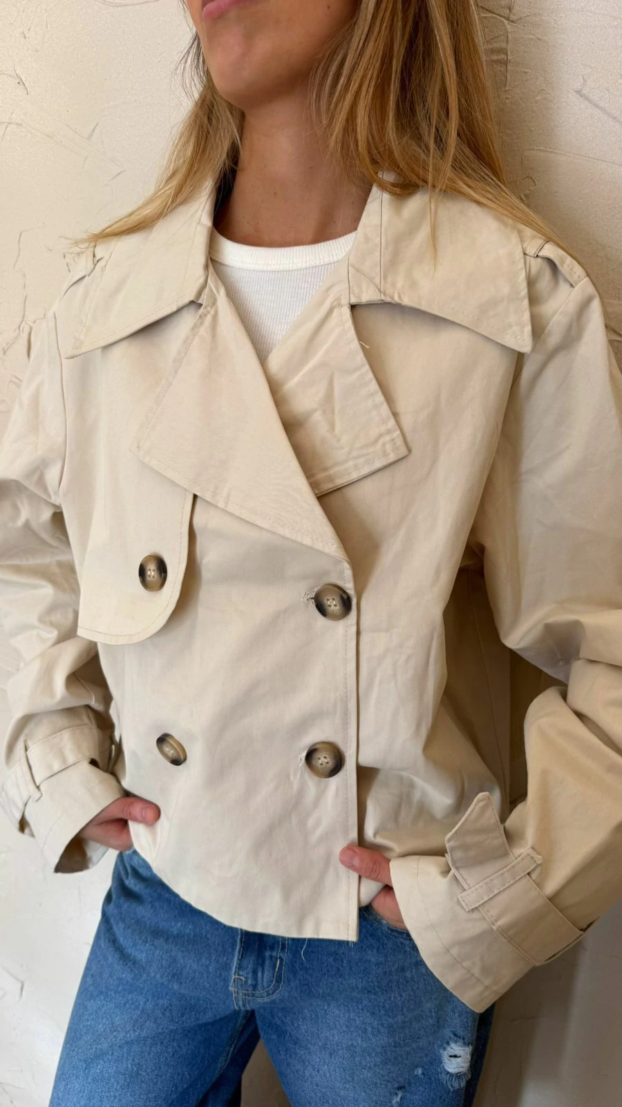 Saco estilo trench, cropped, es la prenda ideal para agregar un toque de sofisticación y modernidad a tu guardarropa. Su diseño corto y su elegante color crema la convierten en una pieza versátil que puedes combinar con todo, desde jeans y pantalones de vestir hasta faldas y vestidos.